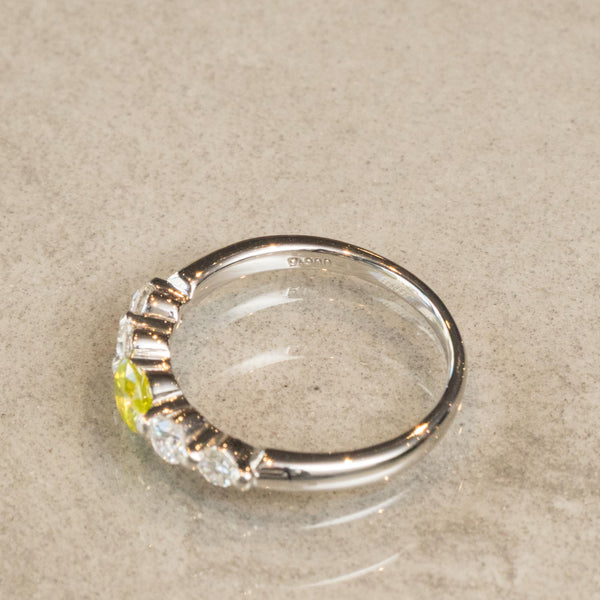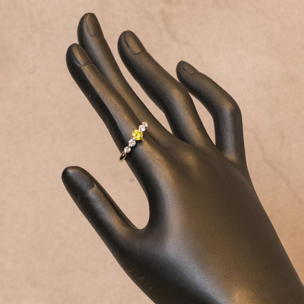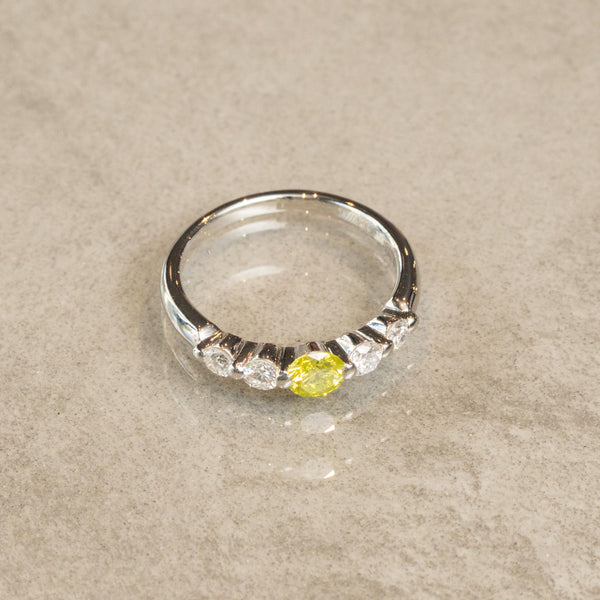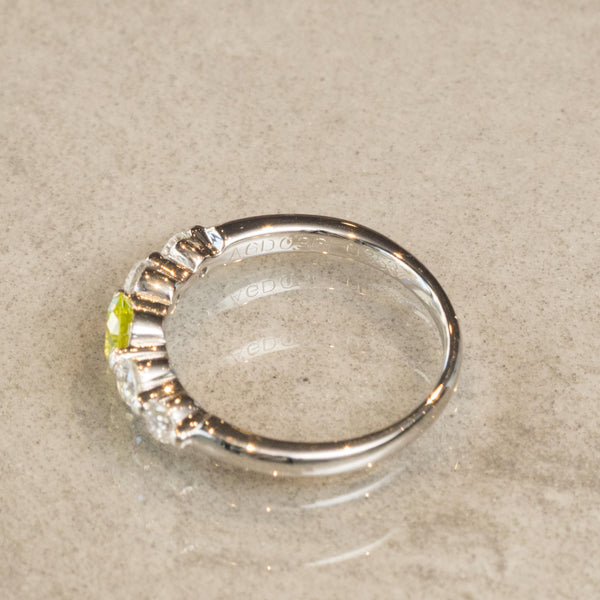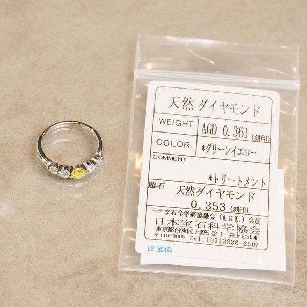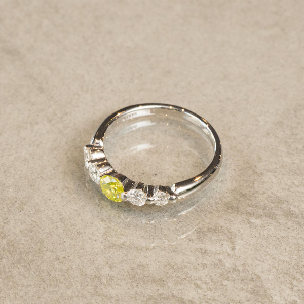 中央に柔らかく輝くグリーンイエローのダイヤモンドをあしらい、その周囲を透明に輝くダイヤモンドが華やかに引き立てるデザインのリングです。