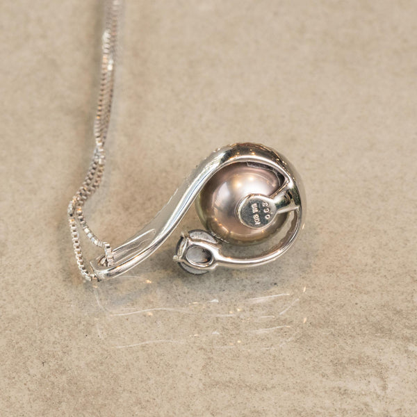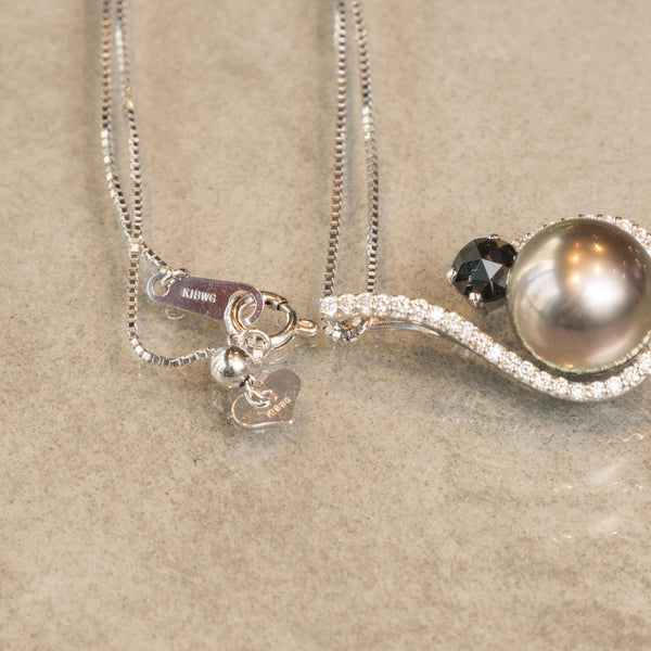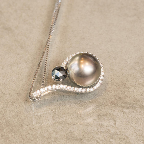 しなやかに描かれた曲線の部分には繊細なダイヤモンドをあしらい、中央の黒蝶パールを優美に引き立てます。全体的にモダンなアクセントを添え、洗練された印象をプラス。