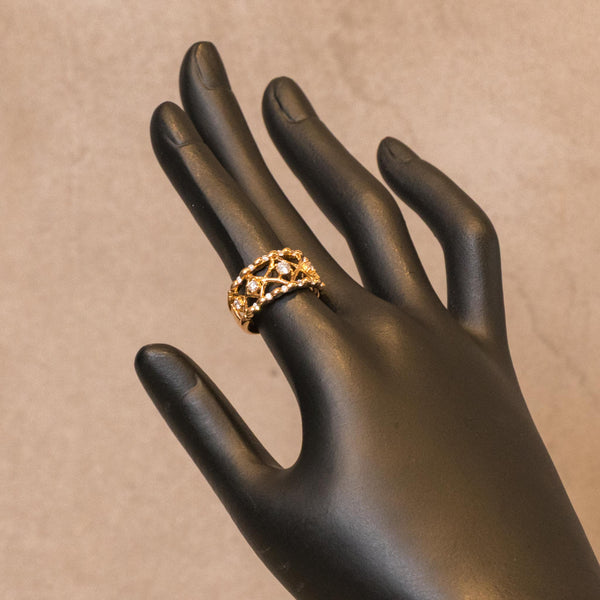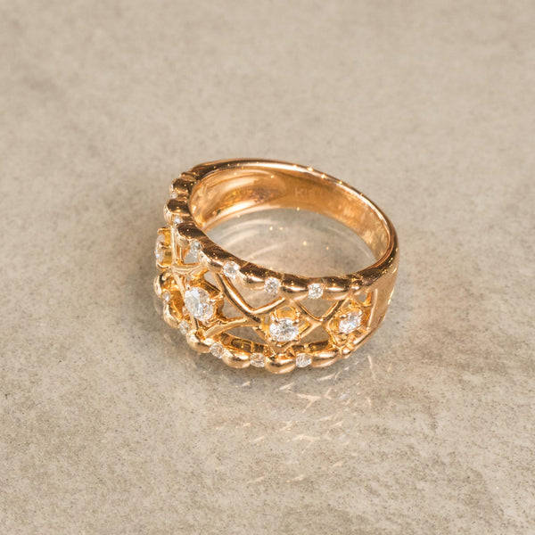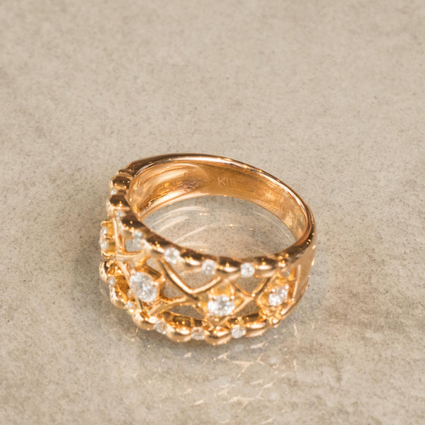 ピンクゴールドの温かみのある輝きと、ダイヤモンドの上品なきらめきを組み合わせたラグジュアリーなデザインのリング。