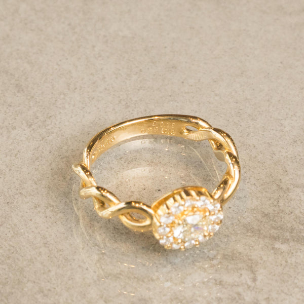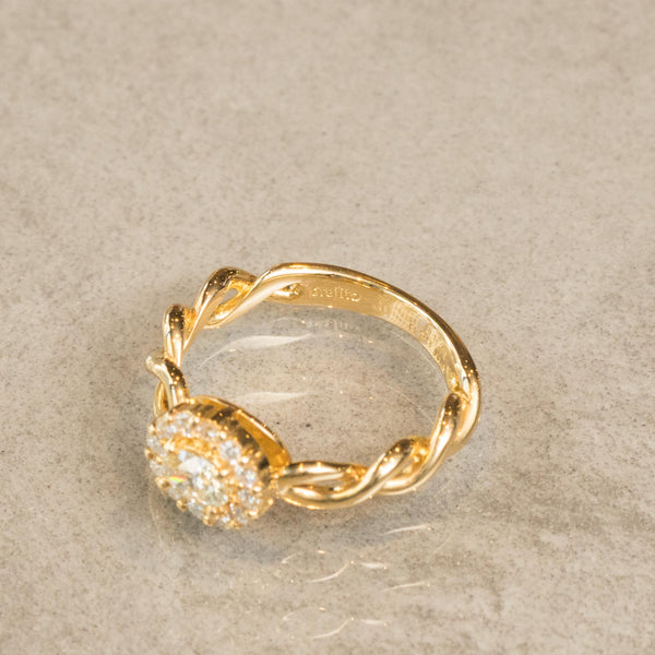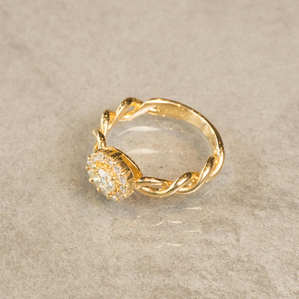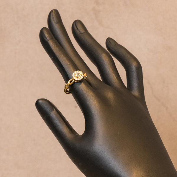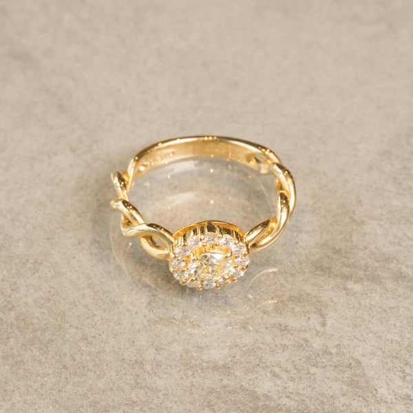 イエローゴールドの光を受け、黄色味がかった眩い輝きを放つダイヤモンドを繊細なホワイトダイヤモンドで囲んだ、小ぶりのラグジュアリーなリング。