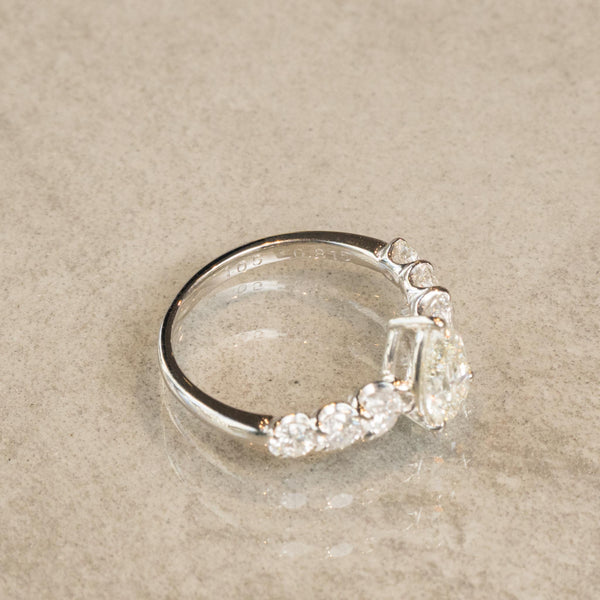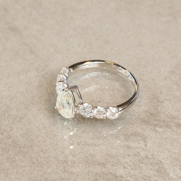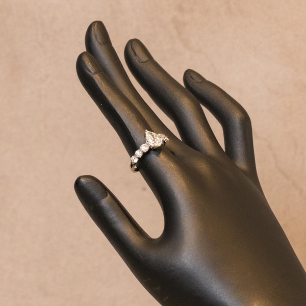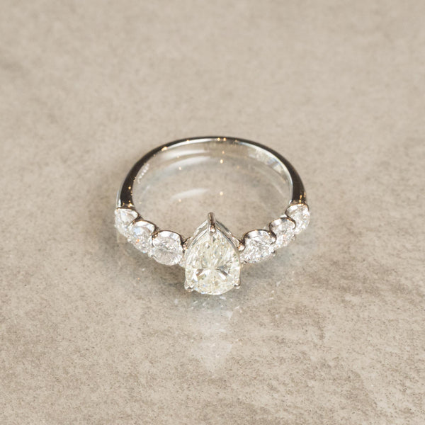 ペアシェイプカットダイヤモンドをセンターにあしらった、エレガントで存在感のあるリングです。