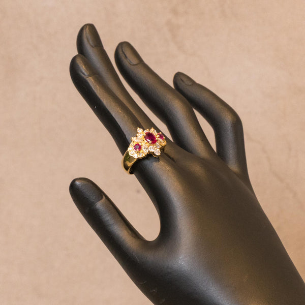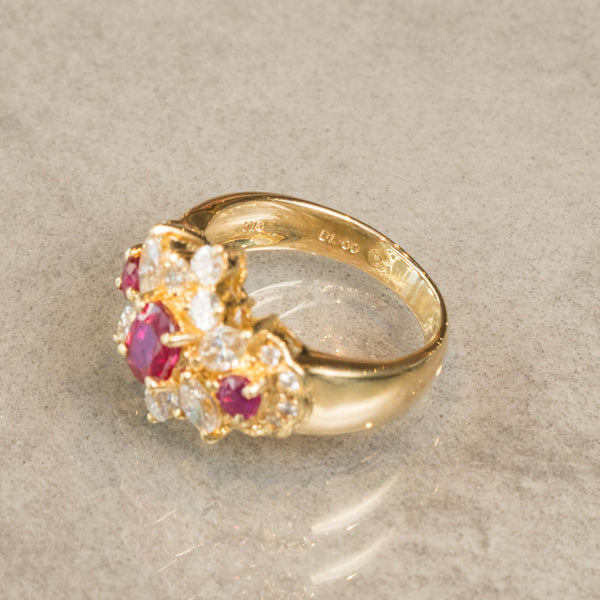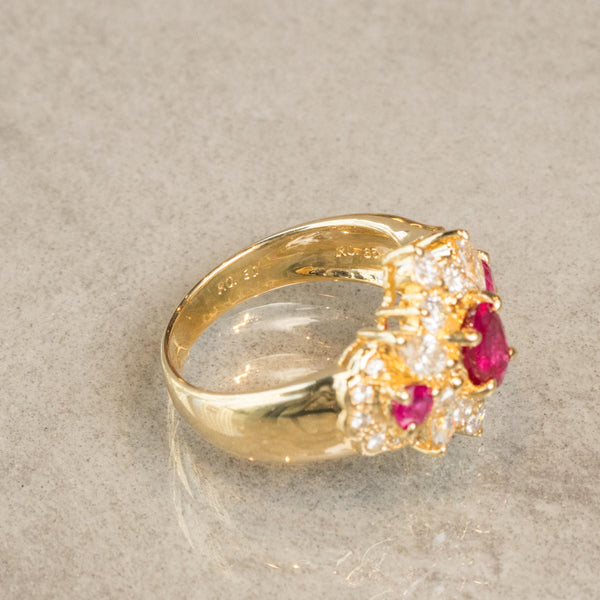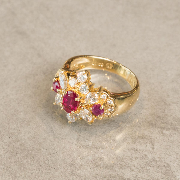 大粒ルビーを中心に左右にもルビーを配置し、さらに周囲を細やかなダイヤモンドで装飾した、存在感溢れるクラシックなデザインのリングです。