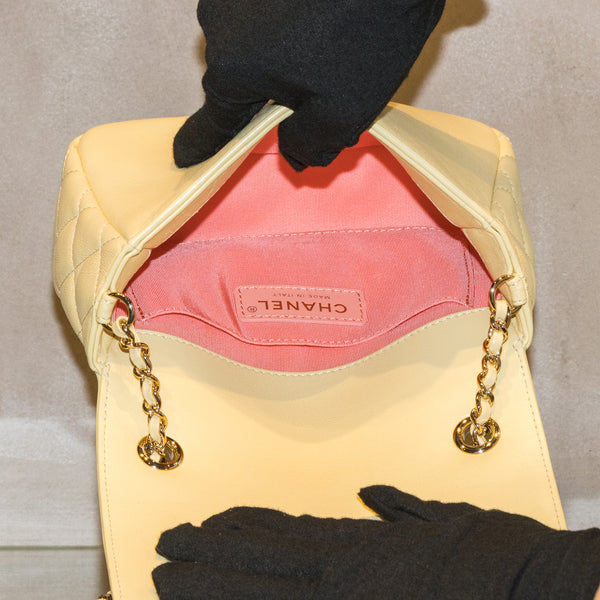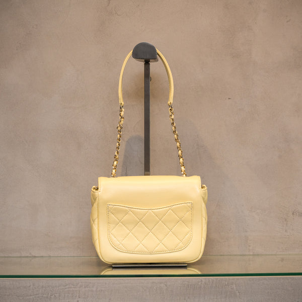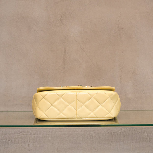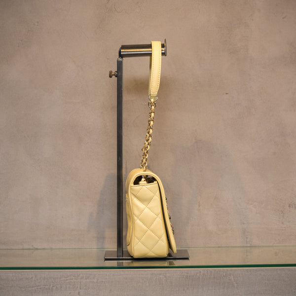 柔らかなイエローのバッグのセンターに色彩豊かなビジューで模った大きなココマークが印象的なバッグです。