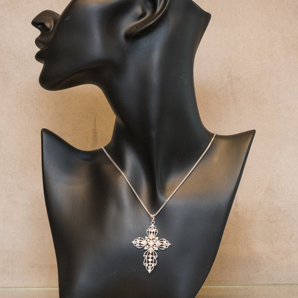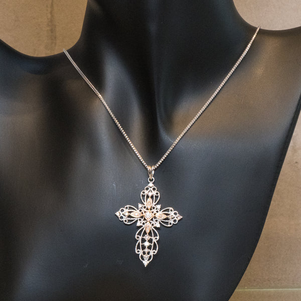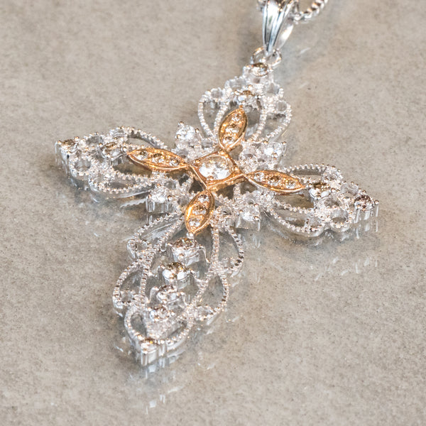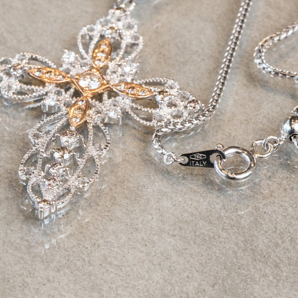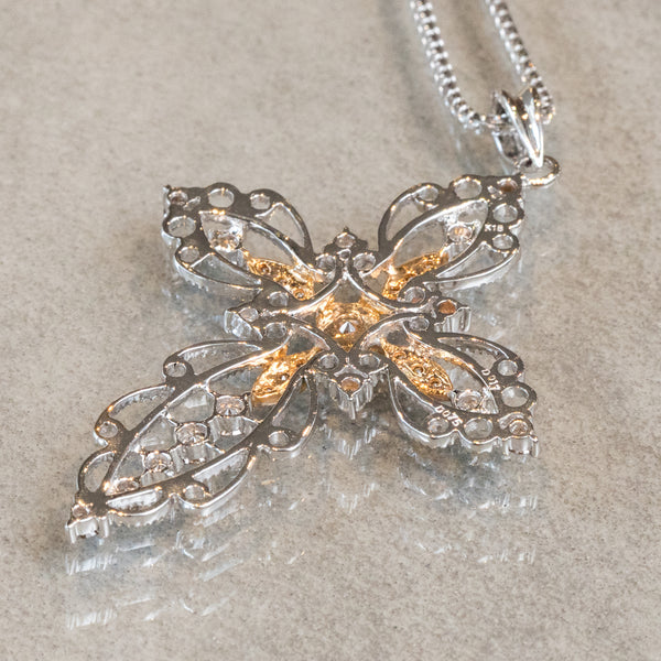 上品なホワイトゴールドをベースに、イエローゴールドで縁取られたダイヤモンドが配置されたデザイン。
