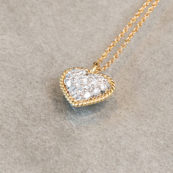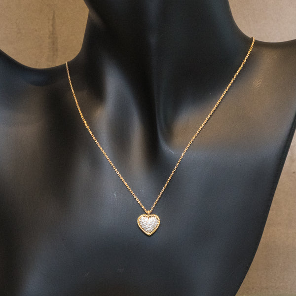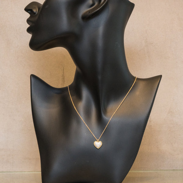 チェーンとフレームは暖かな色味で包み込み、ダイヤモンドを配したハート部分は丸みを帯びたデザインで期待感やうきうきとした高揚感を感じさせます。