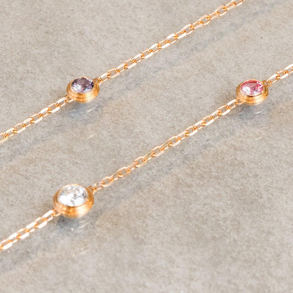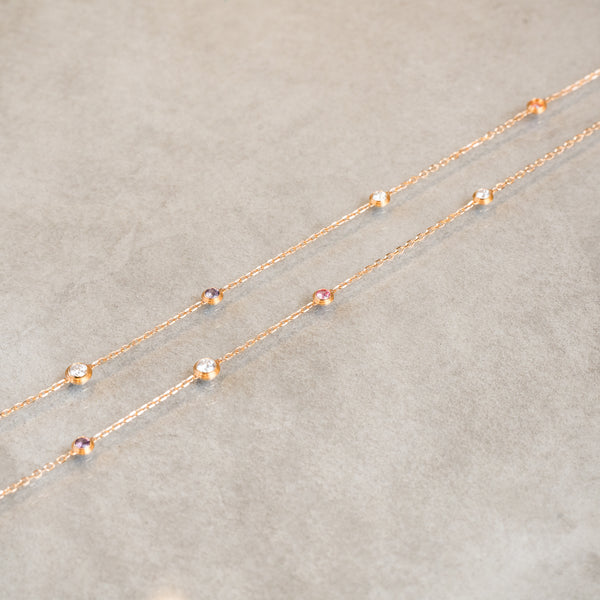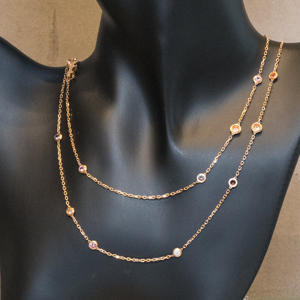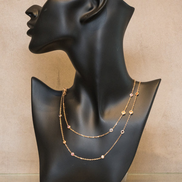 色とりどりの宝石が胸元を彩り、温かみのあるゴールドのチェーンと大人っぽくもありますがどこか楽し気な印象を感じます。