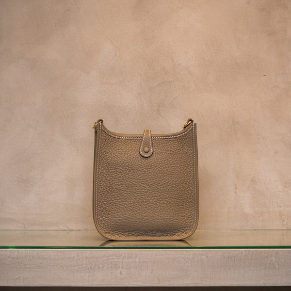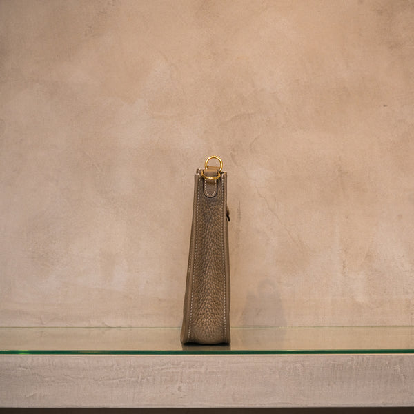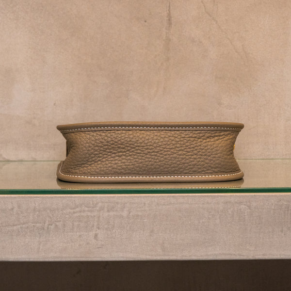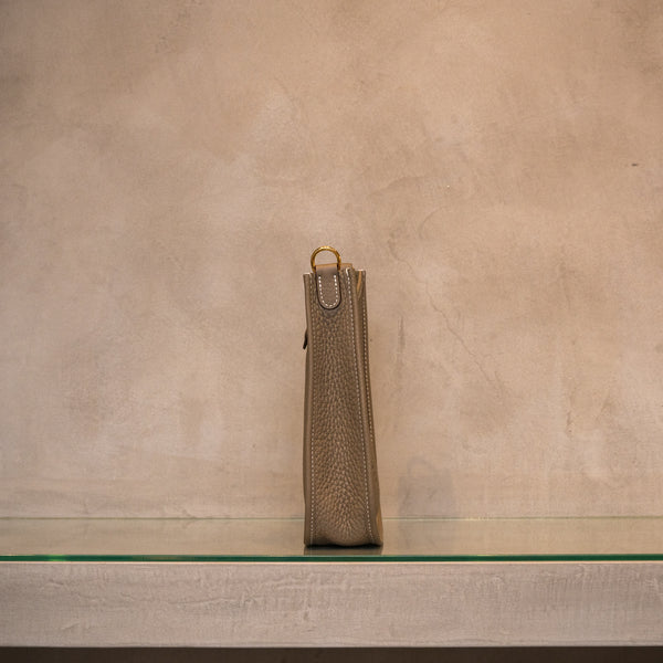 柔らかくマットな質感で発色のいいトリヨンクレマンス素材と美しい白のステッチの組み合わせで、暗くなりがちなエトゥープカラーもエヴリンの言葉の意味通り”いきいきとした”印象に仕上がっています。