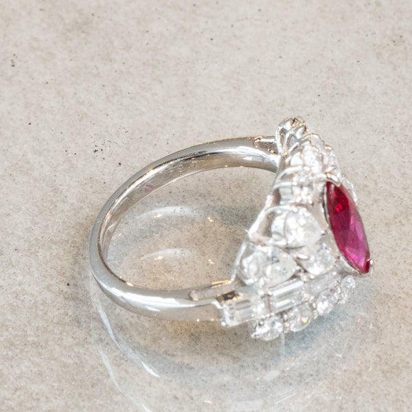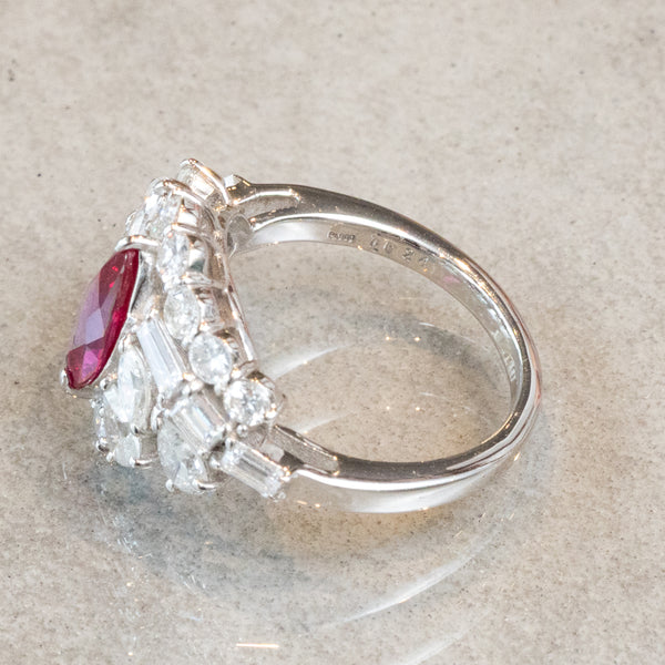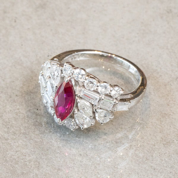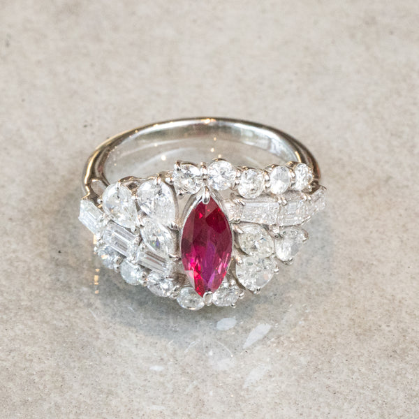 様々なカットのダイヤモンドをランダムに配置し、中央にルビーを配置したリングです。