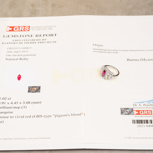 プラチナの土台にダイヤモンドという清潔感のある輝きに、一部のルビーのみが呼称される”ピジョンブラッド”ルビーが情熱的な魅力を演出してくれます。